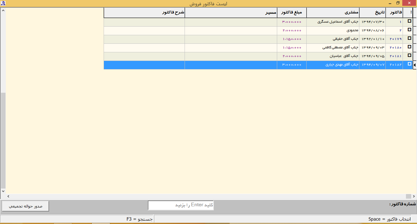 در پنجره باز شده میتوانید با کلید spase فاکتور مورد نظر را انتخاب کنید و دکمه صدور حواله تجمیعی را کلیک کنید.