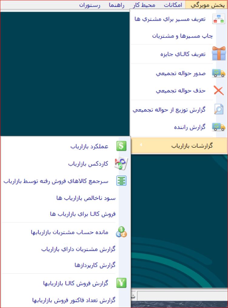 از منوی پخش مویرگی، زیر منو گزارشات بازاریاب را انتخاب کرده، در این قسمت شما میتوانید گزارش هایی نظیر :